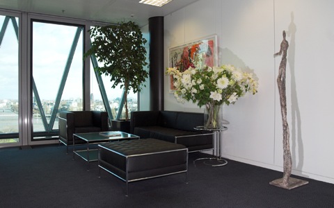 Landmark Frankfurt serviced offices and flexible fully furnished office space to let on Westhafenplatz, Frankfurt, 60327. This Frankfurt business center is located on the 10th and the 11th floor of the Westhafen Tower, a cylindrical office tower completely made of glass, which has already become the trademark of Frankfurt’s skyline, offering ready to go serviced offices, temporary office space for rent, virtual offices, mailing addresses and office space for lease on flexible terms.The Westhafen Tower Business Center is the first design business center in Frankfurt. Open, transparent and filled with light, the Westhafen Tower stands for a new understanding of work and communication. Enjoy the view of the Main River and the Frankfurter skyline. The high-quality and attractively designed entrance hall is your business card, and the first contact between you and your customers. It provides you with an excellent reference that makes every visitor feel that they are welcome. The neighbouring restaurant/bistro gives you the opportunity to relax over a cappucino or enjoy a snack between conferences.The Business Center is only five minutes walking distance from Frankfurt’s main train station. International hotels like Hotel Inter-Continental and Le Méridien Park Hotel are only a few minutes away, as well as the shopping mile and bank district. Please note our other locations in Frankfurt, in Westend at the Bockenheimerlandstraße and in the OpernTurm.