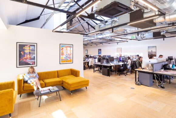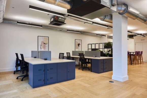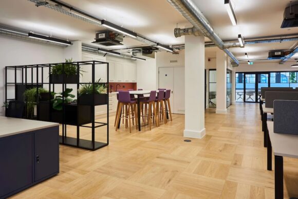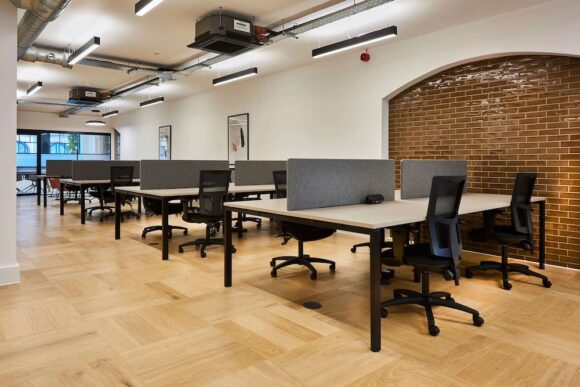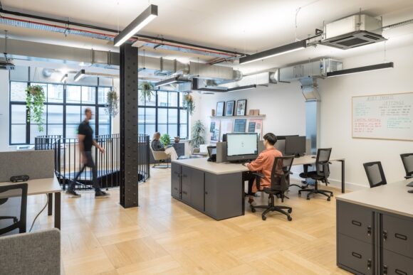 Old Street Works provides individual office suites for 20 to 30 desks, ranging between 1,570 sq ft and 1,872 sq ft — equivalent to up to 79 sq ft per desk.
